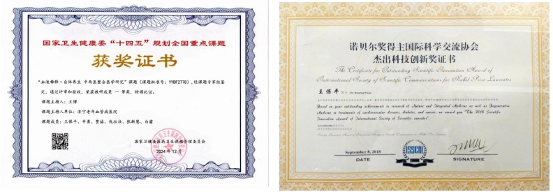 2024年荣获“孔子奖章·仁爱奖”,其“血液稀释·自体再生 中西医整合医学研究”课题列为国家卫生健康委“十四五”规划全国重点课题并荣获国家卫健委教研成果一等奖(课题批准号:YYDF2778)。2025年荣获国家管理委员会标准化认证。