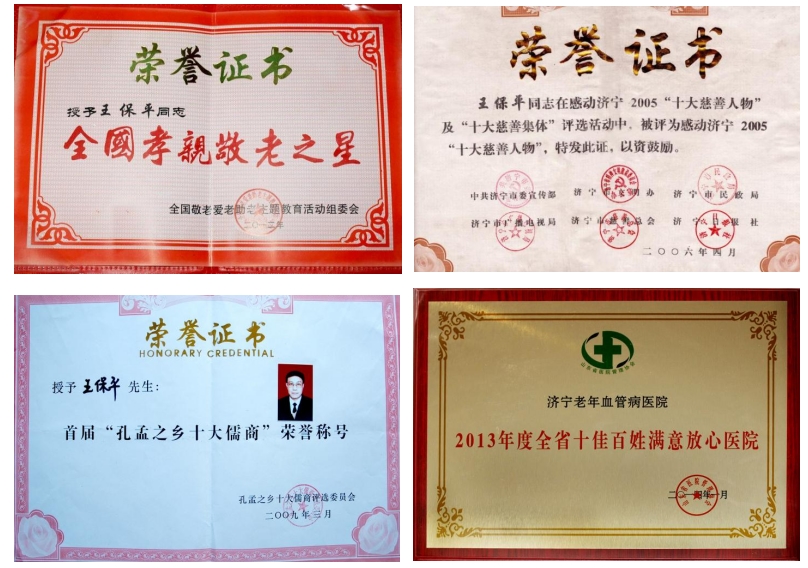 个人先后荣获“中华人文医学奖”“山东省归侨侨眷先进个人”“山东省敬老模范个人”、 “3.15个人荣誉奖章”“感动济宁十大慈善人物”“中华人文医学奖”“孔孟之乡十大儒商”“全国孝亲敬老之星”“山东省优秀医院院长”“济宁市诚信院长”等荣誉。多次载入“中国名人录”“世界名人录”“美国名人录”“剑桥名人录”等。王保平教授被聘为“泰国皇室成员特邀健康顾问”,我院也被授予“中泰皇室成员友好医院”“中泰文化大健康交流友好企业”等荣誉称号。