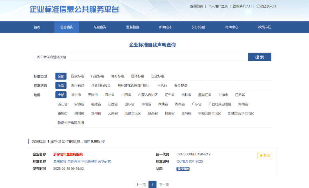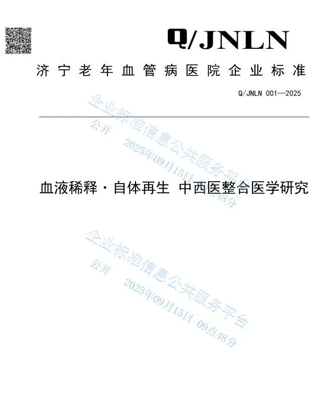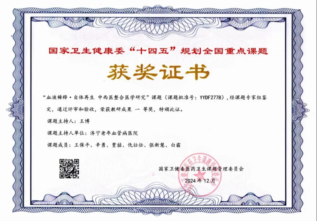 近日,我院《血液稀释及自体再生的中西医整合医学研究》课题获得国家标准化管理委员会企业标准认证, 该课题在2024 年已荣获国家卫生健康委“十四五”规划国家重点课题一等奖。