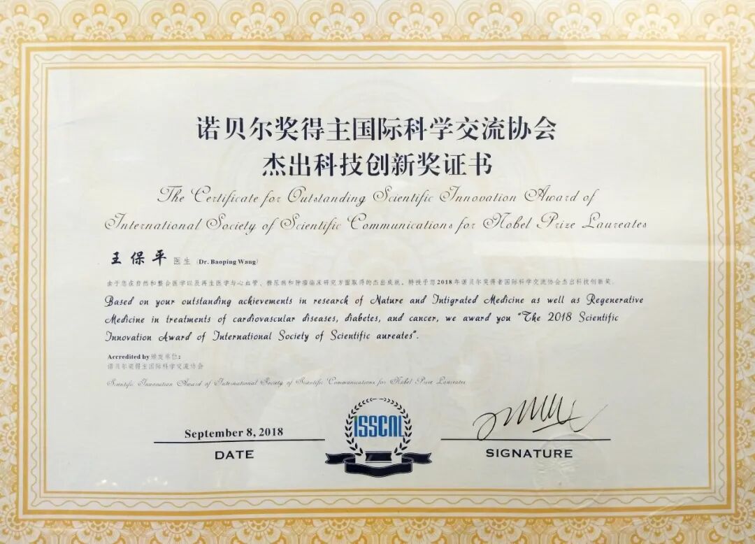 课题负责人王保平校长,先后3 次受邀登上诺贝尔奖获得者医学峰会并发表重要演讲,荣获“诺奖峰会杰出科技创新奖”。现场 4 位诺奖得主主动向其转赠诺贝尔奖复印件,十多位诺奖级专家盛赞研究为“中国式的血液再生医学”“令人震撼的颠覆医学”。其独创的“血液稀释自体再生疗法” 已治愈数十万病患,享誉国内外。